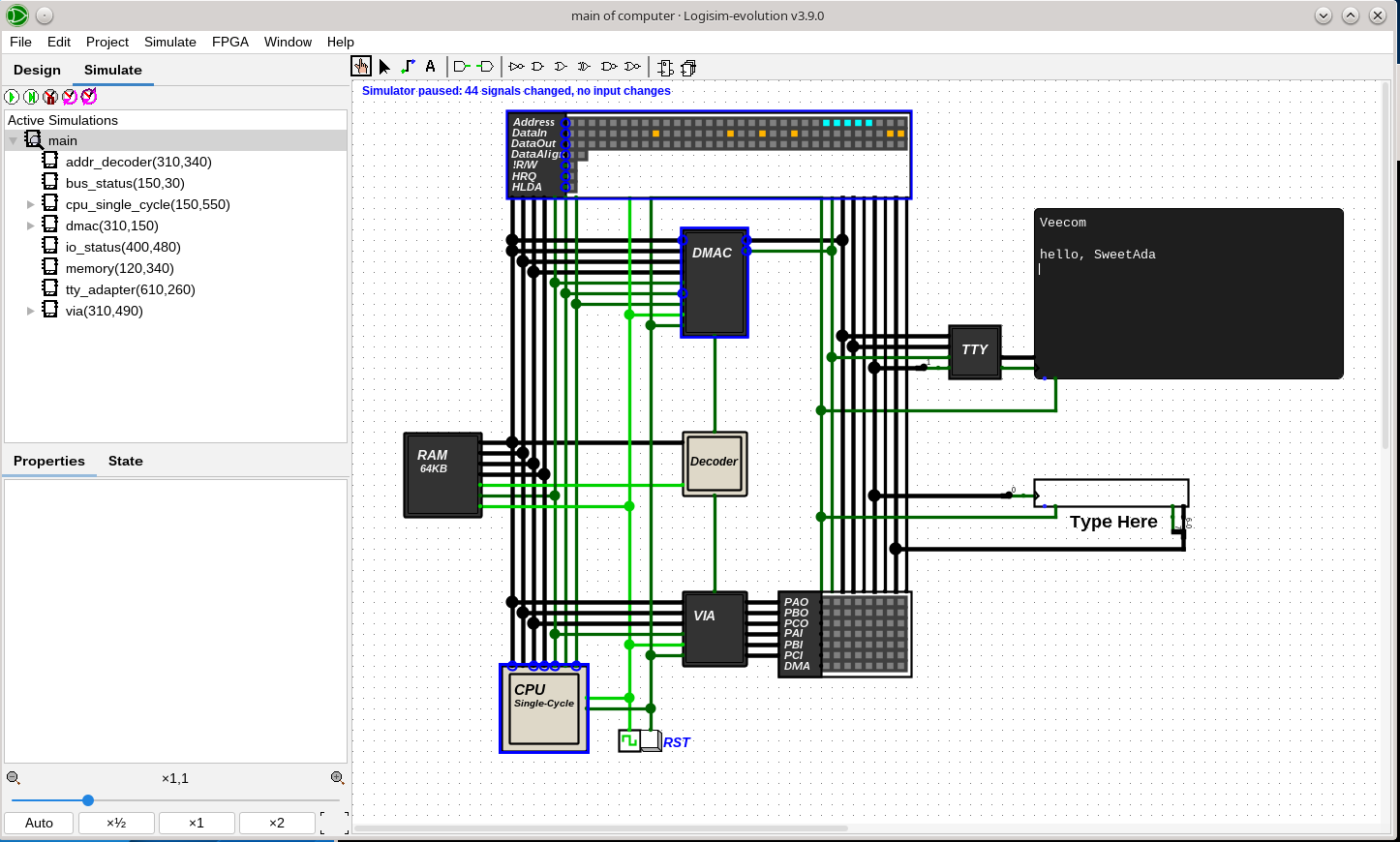 Just for the hardware-cored users, SweetAda, as of commit bbc8ed7, now supports Veecom with no changes to the underlying code base. If you want to see Ada code moving electrons on wires by means of the Logisim simulator, you can try it. Veecom so far lacks exception support, but it simulates an RV32IM CPU, along with a simple DMA controller and a VIA I/O device which interfaces to a TTY console, everything inside the digital simulator.